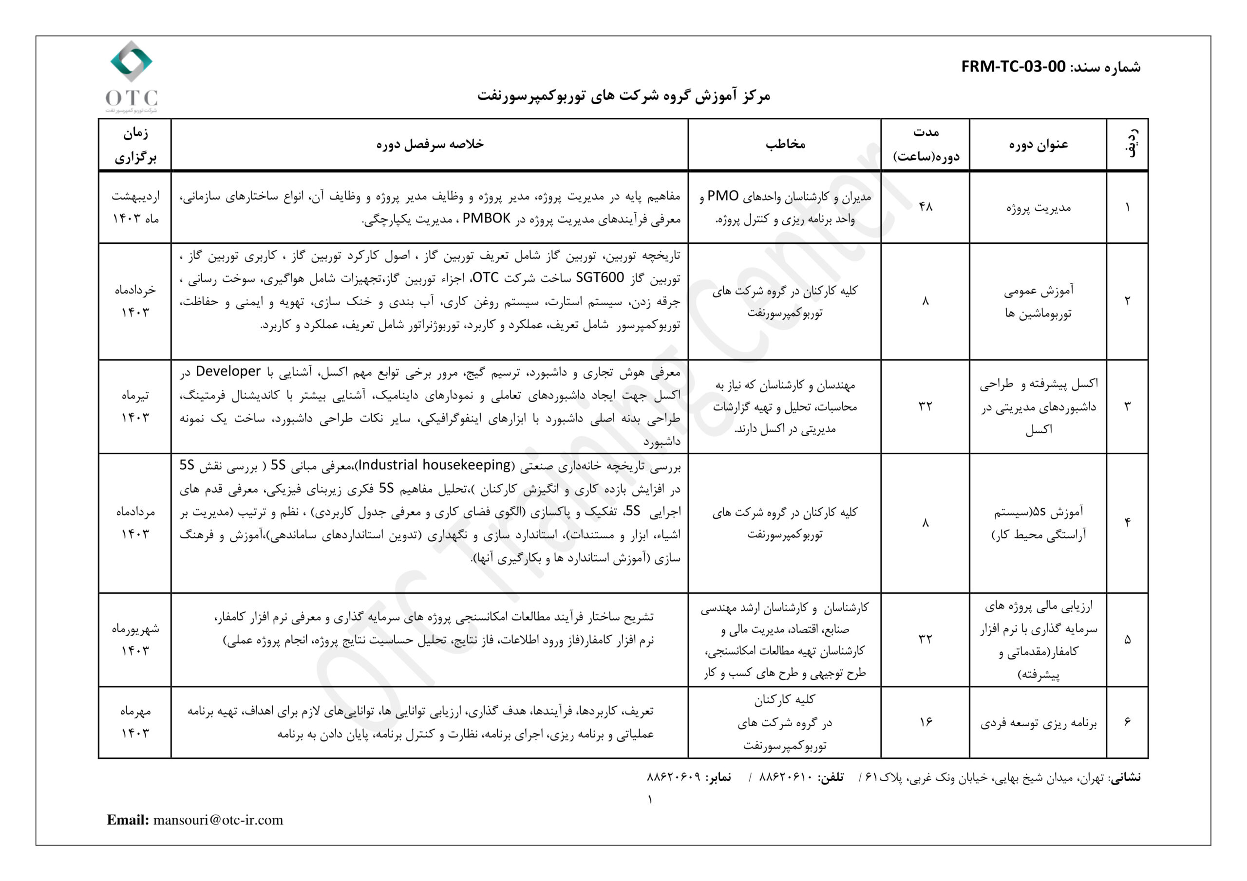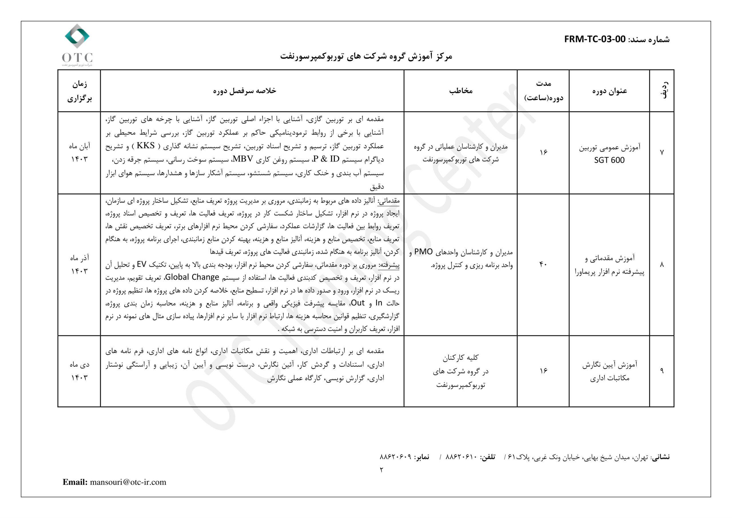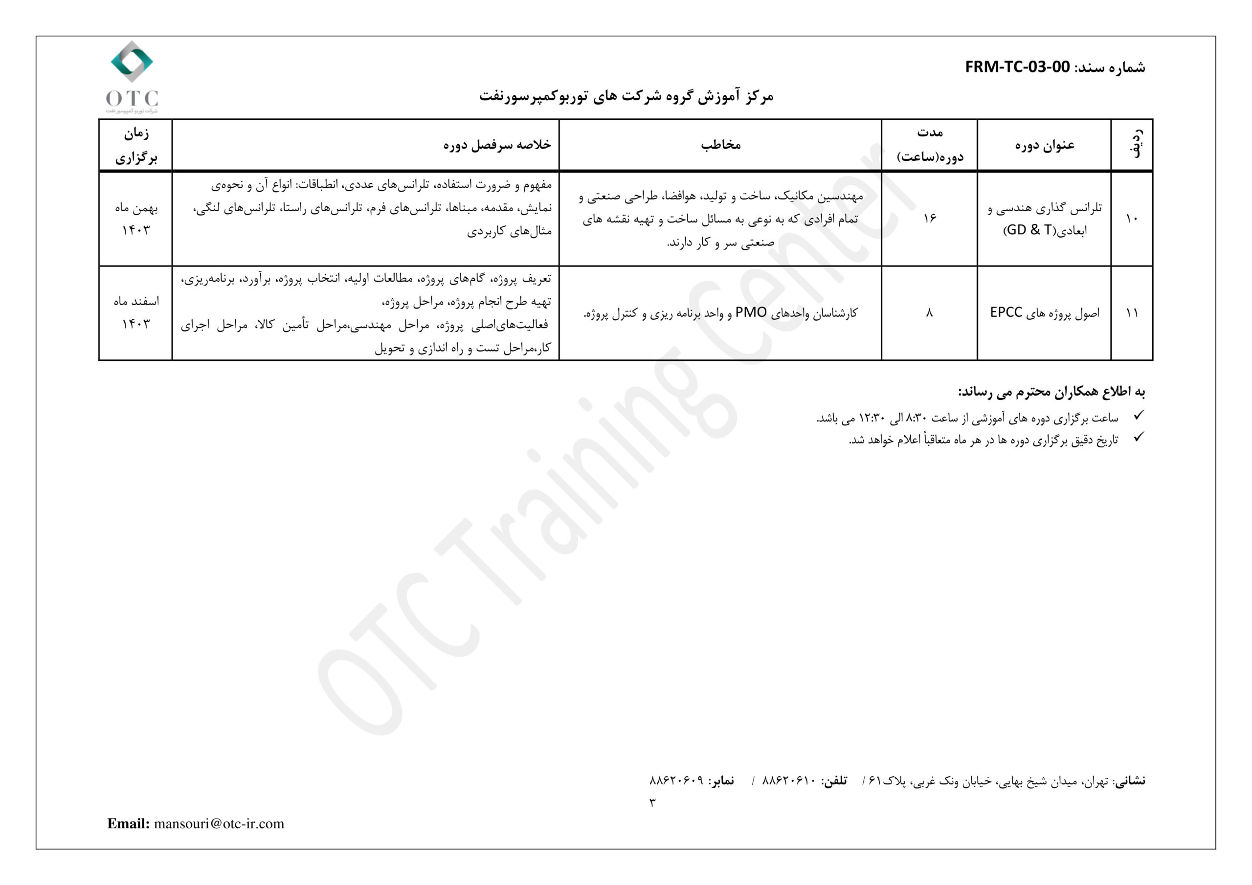 تقویم آموزشی ما به گونهای طراحی شده است که تمامی نیازهای آموزشی را در طول سال پوشش دهد. هر ماه، مجموعهای از دورهها و کارگاههای آموزشی در زمینههای مختلف از جمله مهارتهای نرم، فناوری اطلاعات، مدیریت و رهبری، و تخصصهای فنی ارائه میشود. این تقویم به شما امکان میدهد تا برنامهریزی مناسبی برای شرکت در دورههای مورد نظر خود داشته باشید و از فرصتهای یادگیری و توسعه حرفهای به بهترین نحو بهرهمند شوید. برای اطلاع از جزئیات هر دوره و ثبتنام، میتوانید به بخش ثبتنام آنلاین مراجعه کنید یا با تیم ما در مرکز آموزشی تماس بگیرید.